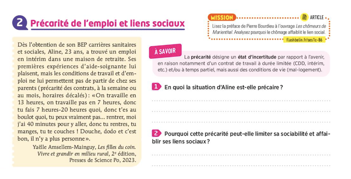 La précarité désigne une situation d’instabilité (emploi temporaire, revenus irréguliers, conditions de vie fragiles). Elle rend l’intégration sociale plus difficile.