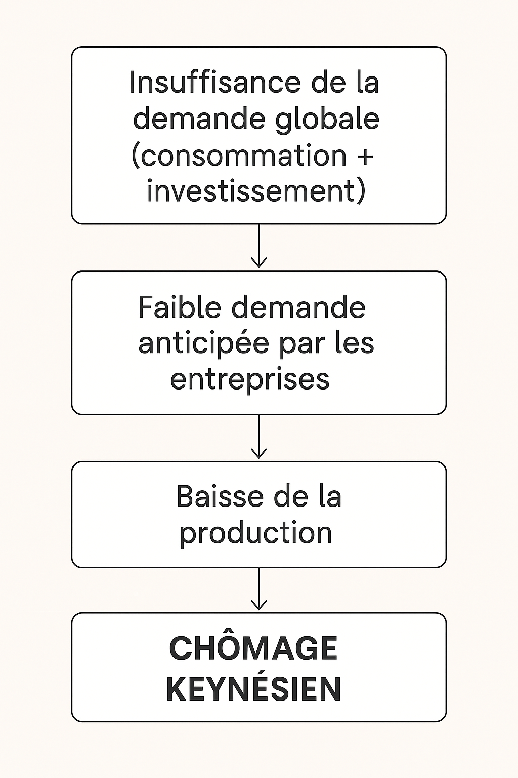 Selon la théorie keynésienne : l’économie ne s’ajuste pas automatiquement vers le plein emploi en cas de crise, il faut donc stimuler la demande globale (consommation + investissement + dépenses publiques) pour relancer l’activité.