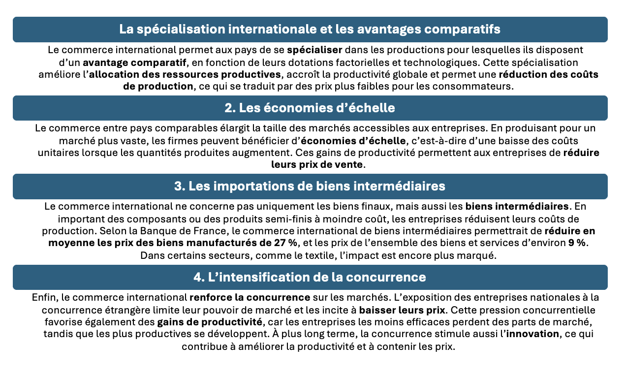 Le développement du commerce international a pour effet majeur de réduire le prix moyen des biens et des services pour les consommateurs.