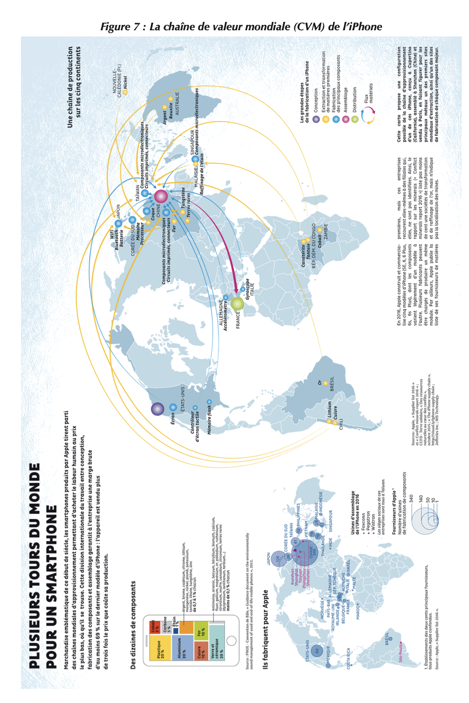 La production du smartphone Apple constitue un exemple emblématique de chaîne de valeur mondiale. L’iPhone est en effet le résultat d’un processus productif fragmenté et internationalisé, mobilisant des entreprises et des territoires répartis sur l’ensemble de la planète.