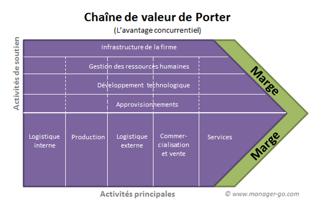 L’ensemble de ces activités constitue ce que l’économiste Michael Porter appelle la chaîne de valeur. Chaque activité contribue à créer de la valeur tout au long du processus productif.