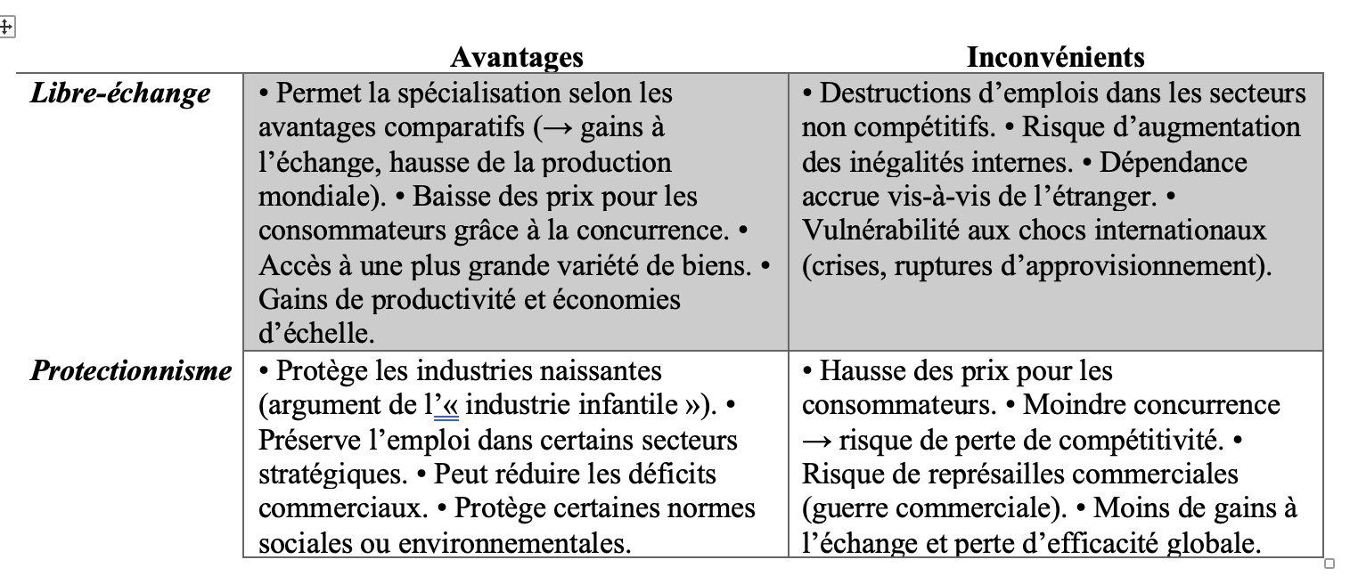 Ces effets contrastés alimentent le débat entre libre-échange et protectionnisme. Si certains arguments peuvent justifier un protectionnisme ciblé et temporaire, les mesures protectionnistes réduisent le plus souvent le bien-être global, provoquent des représailles commerciales et sont peu adaptées à un monde structuré par les chaînes de valeur mondiales.